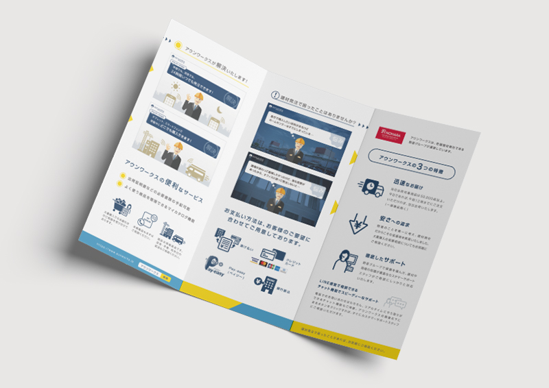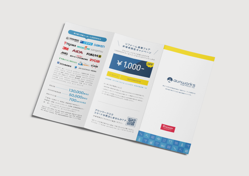 プロ向け建材通販サイト「アウンワークス」様がリフォーム産業フェアに出展した際のパンフレットを制作いたしました。(アニメーションを活かした動画コンテンツも一緒に制作してしております。)